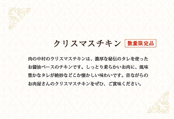 季節限定の特別な味わい、フライのチキンとはまた一味違う、昔ながらのお肉屋さんのクリスマスチキンを、ぜひ、ご賞味ください。